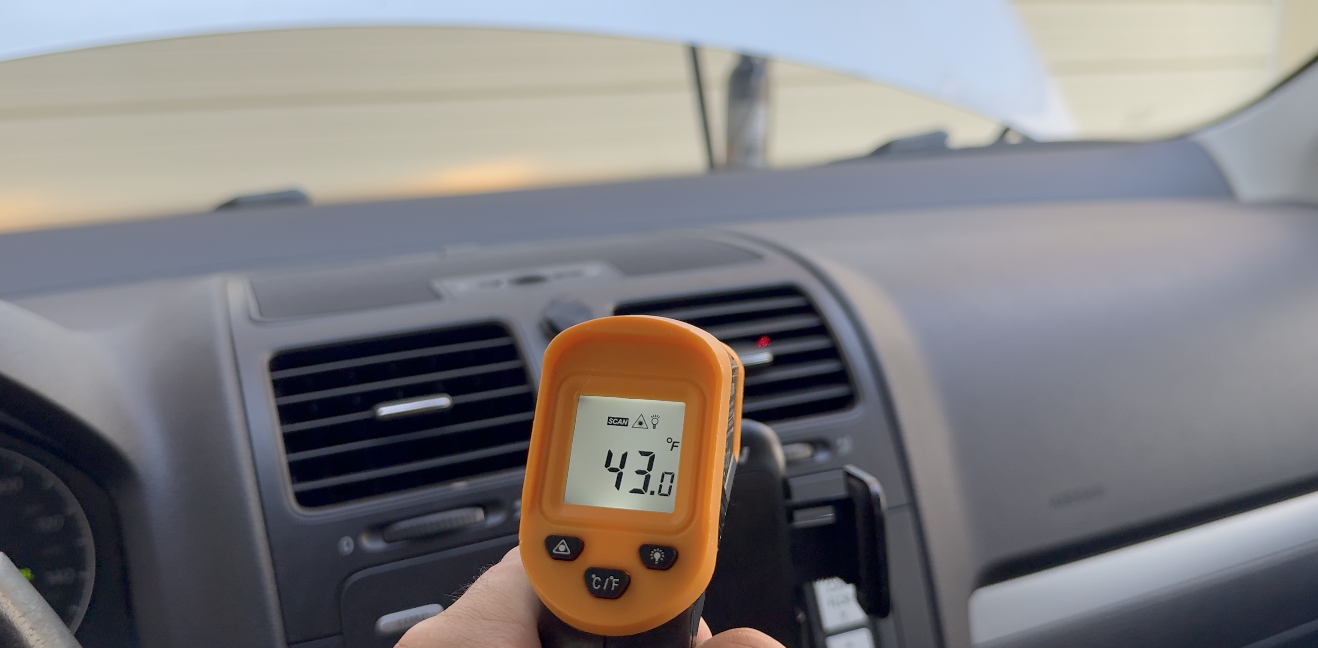 Check the Vent Temperature Use a thermometer to measure the air blowing out of your vents. Initially, it might still feel warm, but after 10 minutes or so, the temperature should start dropping. In this case, the air dropped from 82°F to about 40°F after about 15 minutes of running the car.